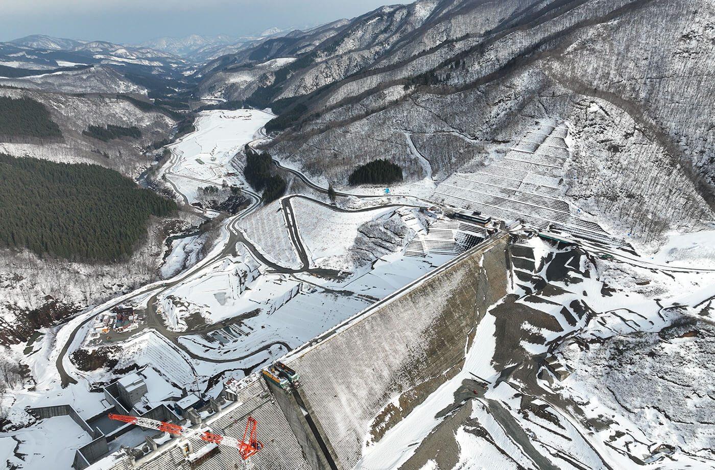 施工状況の全景、堤体・洪水吐・減勢工の施工状況などが見られます。